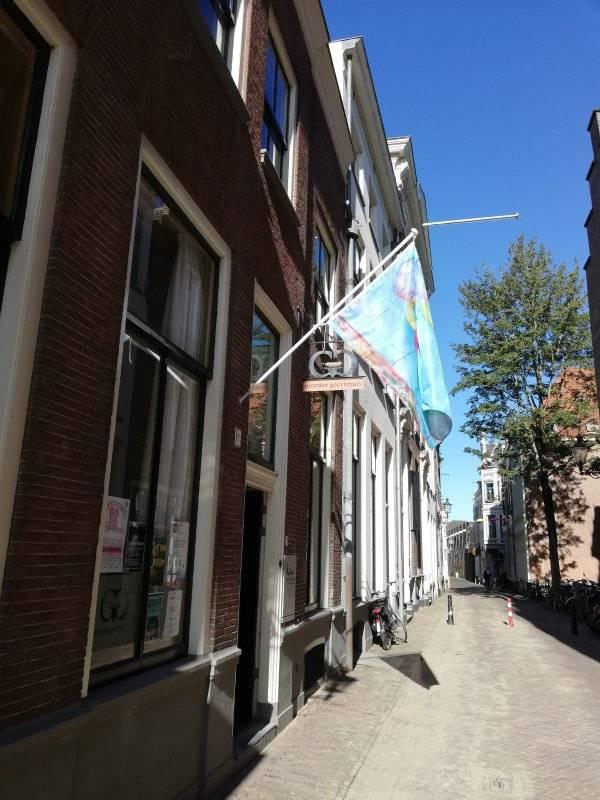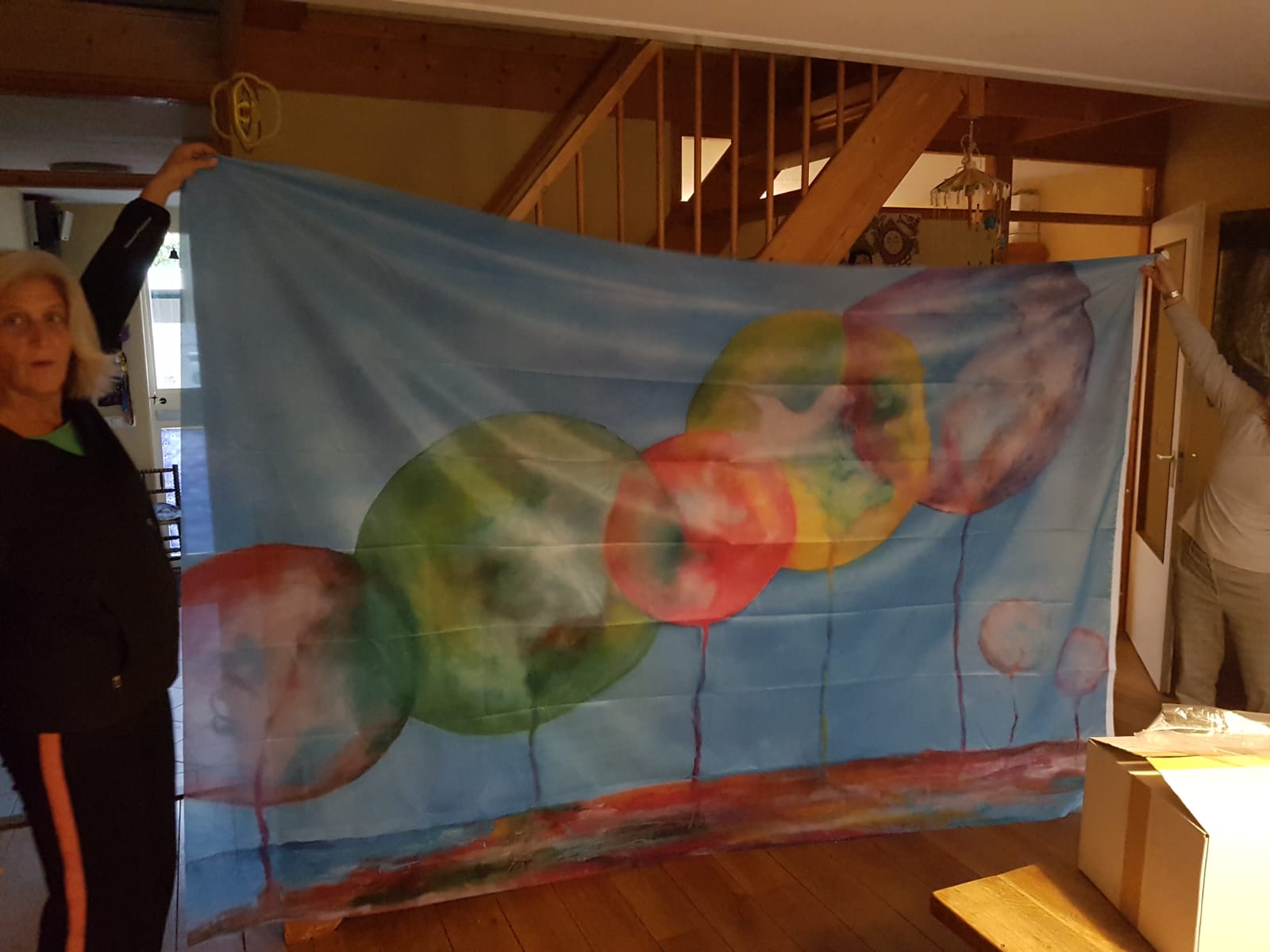 Hoe beeld je vrede uit? De gekleurde transparante bollen en het hemelsblauw zijn beeldbepalend. Alles straalt rust, verbondenheid en eigenheid uit. De kleuren die in elkaar overlopen en organische lijnen vormen bieden veel ruimte voor de eigen invulling door de toeschouwer. Zo verbeeldt de vlag dat vrede gaat over je verbonden voelen ondanks de verschillen, met een gezamenlijke voedingsboden en groeiend naar het licht.