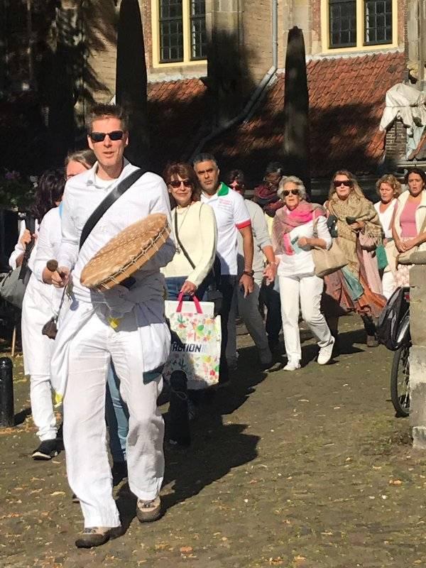 Vanuit vier windrichting liepen groepjes mensen richting het Grote Kerkhof. Ze zongen onder begeleiding van gitaar en drums the Prayer of the Mothers, het lied van de Israëlisch-Palestijnse vrouwen die gezamenlijk strijden voor vrede. Op het Grote Kerkhof kwamen de groepen bij elkaar bij de vredestent.