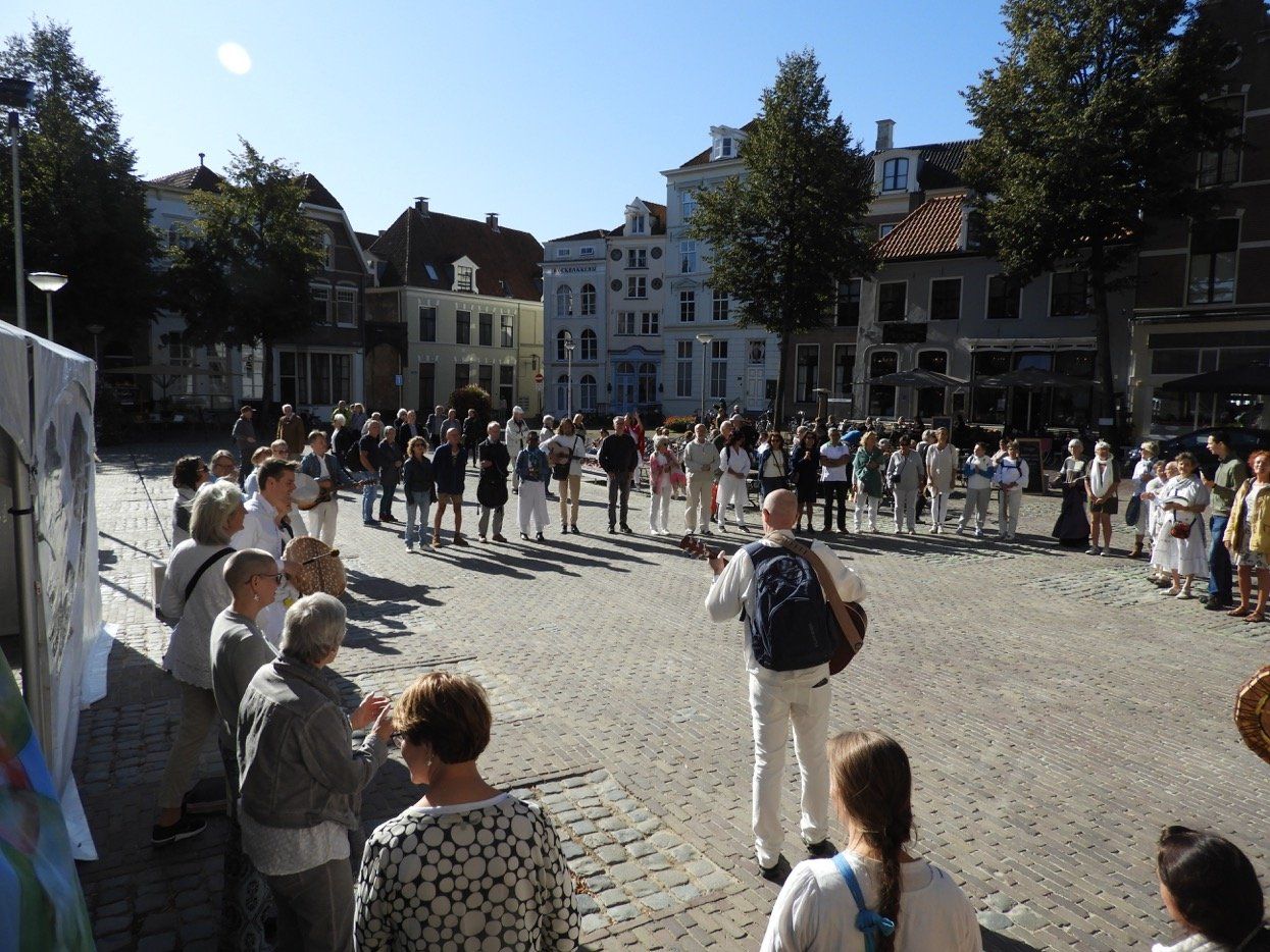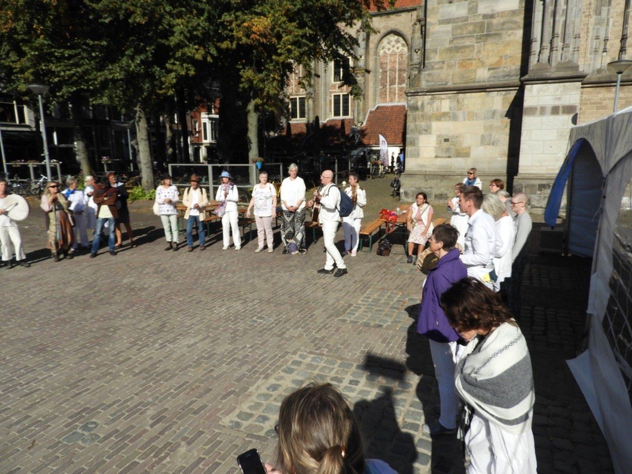 Op het Grote Kerkhof stond de hele middag een vredestent waar het bruiste van de activiteiten: muziek, duifjes vouwen, brieven schrijven voor Amnesty, zingen, ontmoeting en gezelligheid!